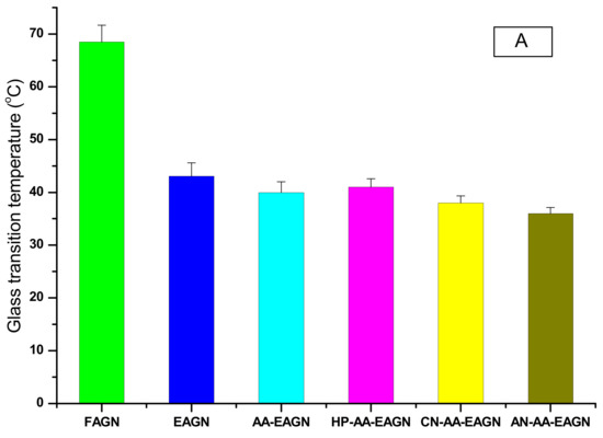 In the DSC analysis, the glass transition temperature (Tg) and glass transition energy (ΔH) are determined (Figure 4). The results of this study indicate that HP-AA-EAGN has a lower Tg (41 °C) and ΔH (12 J/g) compared to FAGN (68.5 °C; 147 J/g, respectively), whereas the Tg and ΔH of EAGN and AA-EAGN were observed at 43 °C, 47 J/g and 40 °C, 21 J/g, respectively. It is reported that amorphous materials have a lower Tg compared to crystalline materials []. The ΔH and Tg of the extrudate EAGN appeared as very weak transitions, as more crystalline materials act as physical crosslinks that restrain the mobility of the amorphous regions []. It has been previously reported that the Tg of the extrudate formulation can be reduced to 40 °C by adding HPMC polymer []. The addition of a plasticizer in the melt extrusion process lowers the Tg and melt viscosity of the extrudate materials. Plasticizers typically work by embedding themselves between polymer chains and minimizing secondary interactions, so that the polymer chain segments are relatively free to move. Therefore, the chain segments maintain their mobility up to a lower temperature than normal. After further cooling, the mobility of the plasticizer freezes at the glass transition temperature. Moreover, the plasticizer decreases the viscosity and increases the free volume, thus significantly lowering the glass transition temperature [].