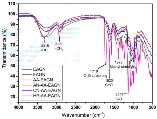 Fourier-transform infrared spectroscopy (FTIR) monitors the vibrations of the functional groups that characterize the molecular structure and observes the progress of the shifting and stretching of functional groups. FTIR spectroscopy was used to confirm the physical crosslinking between the AGN and HPMC biopolymers and showed new functional groups produced in the AGNC formulation. The spectra are presented in (Figure 5), which shows that the splitting peak is in the range 1700−3500 cm−1 in polymer-mediated extrudate AGNC; however, no splitting peak was observed in FAGN in the same range.