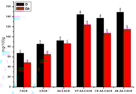 Table 5 shows that the total phenolic (2832 mg/100 g) and total flavonoid (418 mg/100 g) contents were higher in the formulation of HP-AA- EAGN compared to FAGN (1421 mg/100 g, 119.5 mg/100 g, respectively). In the same way, the decursin (148.38 mg/100 g) and decursinol angelate (123.96 mg/100 g) was significantly higher in HP-AA-EAGN compared to FAGN (67.28 mg/100 g, 48.56 mg/100 g, respectively) (Figure 6). Following the phenolic and flavonoid content of the AGNC formulation, the antioxidant capacity was increased in the formulation of HP-AA-EAGN compared to the control measured by the DPPH and FRAP methods (Figure 7).