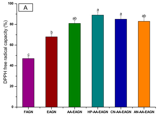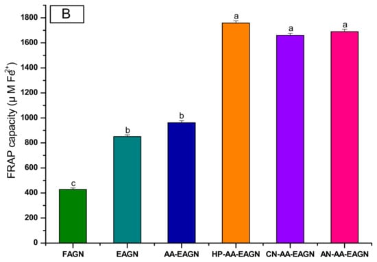 The antioxidant capacity of the AGNC. DPPH (A) and FRAP (B). Values marked by different letters in each column are significantly different in the t-test (p < 0.05).