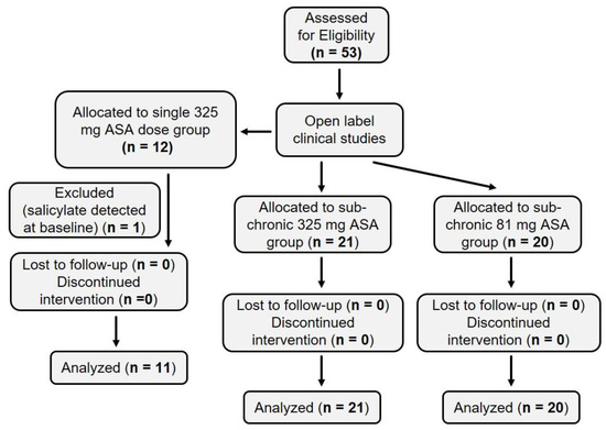 CONSORT flowchart. A total of 53 subjects were eligible and enrolled. Twelve subjects were enrolled in the single 325 mg acetylsalicylic acid (ASA) cohort, and one subject was excluded because salicylate was detected in the baseline (pre-ASA) plasma sample. Twenty-one and 20 subjects were enrolled in the sub-chronic 325 mg and 81 mg ASA cohorts, respectively. All data from these 41 subjects were analyzed.