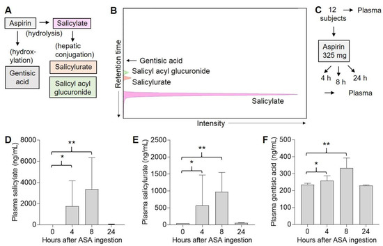 Detection of ASA metabolites in human plasma. (A), Metabolism of ASA. (B), Liquid chromatography–mass spectrometry (LC–MS) detection of ASA metabolite standards. (C), Experimental design. Human subjects were each given a single 325 mg dose of ASA, and blood was drawn both before (0 h) and either 4 (n = 5), 8 (n = 3), or 24 (n = 3) h later. Plasma was isolated from blood, and 0.5 mL was extracted for LC–MS analysis. (D), Plasma salicylate levels. Error bars indicate SEM. * p = 0.02, ** p = 0.001. (E), Plasma salicylurate levels. Error bars indicate SEM. * p = 0.07, ** p < 0.001. (F), Plasma gentisic acid levels. Error bars indicate SEM. * p = 0.03, ** p < 0.001. Note: ASA and salicyl acyl glucuronide were not detected in any of the samples.
