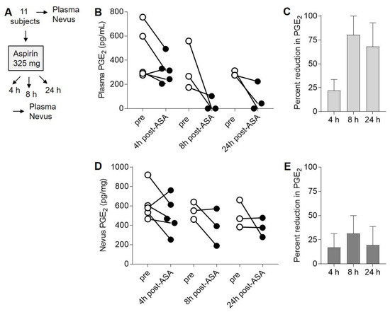 Next, we examined the levels of PGE2 in both plasma and nevi obtained from these 11 subjects both before (0 h) and either 4, 8, or 24 h after ASA exposure (Figure 3A). Determination of PGE2 from these samples by LC–MS revealed reduction in plasma PGE2 levels in four of five subjects at 4 h, in three of three subjects after 8 h, and in three of three subjects at 24 h (Figure 3B). The average percent reduction in plasma PGE2 at each time point ranged from 25% to 75% (Figure 3C), and there was not a significant (p = 0.09, ANOVA) difference in PGE2 reduction between the three time points. Because we initially encountered technical difficulties analyzing ASA metabolites and PGE2 in homogenized nevi by LC–MS, we used ELISA for all subsequent measurements of PGE2. Nevus PGE2 levels were reduced in four of five subjects at 4 h, in two of three subjects after 8 h, and in one of three subjects at 24 h (Figure 3D). The average percent reduction in nevus PGE2 at each time point ranged from 20% to 30% (Figure 3E), and there was not a significant (p = 0.8, ANOVA) difference in PGE2 reduction between the three time points. Thus, there was variability between subjects and time points in the magnitude of ASA-mediated PGE2 suppression in both plasma and nevi, and there did not appear to be an optimal time point for observing PGE2 reduction following a single dose of ASA in the pilot study.