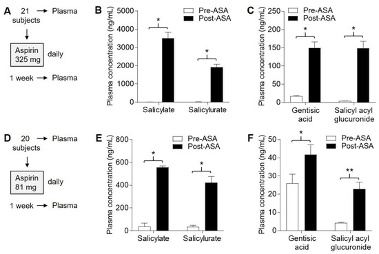 Detection of ASA metabolites in plasma following 1 week of daily ASA exposure. Human subjects were each given ASA daily for one week, and tissue samples were obtained both before (pre) and after (post) this period. (A), Protocol for 325 mg dosing. (B), Levels of salicylate and salicylurate in plasma in the 325 mg cohort. * p < 0.0001, paired t-test. (C), Levels of gentisic acid and salicyl acyl glucuronide in plasma in the 325 mg cohort. * p < 0.0001, paired t-test. (D), Protocol for 81 mg dosing. (E), Levels of salicylate and salicylurate in plasma in the 81 mg cohort. * p < 0.0001, paired t-test. (F), Levels of gentisic acid and salicyl acyl glucuronide in plasma in the 81 mg cohort. * p = 0.04, ** p < 0.0001, paired t-tests.