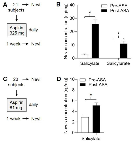 Detection of ASA metabolites in nevi following 1 week of daily ASA exposure. Human subjects were each given ASA daily for one week, and nevi were obtained both before (pre) and after (post) this period. (A), Protocol for 325 mg dosing. (B), Levels of salicylate and salicylurate in nevi in the 325 mg cohort. * p < 0.0001, paired t-test. (C), Protocol for 81 mg dosing. (D), Levels of salicylate and salicylurate in nevi in the 81 mg cohort. * p < 0.01, paired t-test. Salicylurate was detected in nevi of only two subjects from the 81 mg cohort (not shown). Gentisic acid and salicyl acyl glucuronide were not detected in any of the nevi.