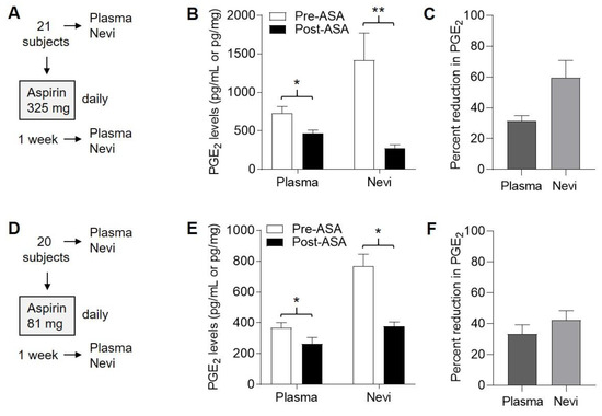 Suppression of PGE2 in plasma and nevi following 1 week of daily ASA exposure. Human subjects were each given ASA daily for one week, and blood and nevus samples were obtained both before (pre) and after (post) this period. (A), Protocol for 325 mg dosing. (B), Levels of PGE2 in plasma and nevi in the 325 mg cohort. Error bars represent SEM. * p < 0.0001, ** p = 0.004, paired t-tests. (C), Average percent reduction in PGE2 levels from (B). Error bars represent SEM. (D), Protocol for 81 mg dosing. (E), Levels of PGE2 in plasma and nevi in the 81 mg cohort. * p < 0.0001, paired t-tests. (F), Average percent reduction in PGE2 levels from (E). Error bars represent SEM.