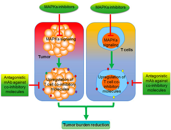 While we have discussed recent efforts involving OX40 and 4-1BB, other immune checkpoints are now under early investigation including the myeloid cell-intrinsic immune-checkpoint V-domain immunoglobulin suppressor of T-cell activation (VISTA), though it is unknown how strategies targeting VISTA will interact with MAPK inhibition [89]. Further, as chimeric antigen receptor T (CAR-T) cell therapy advances into clinical use for acute lymphoblastic leukemia and advanced lymphomas [90], the combination of CAR-T-cells and MAPK inhibitors also warrants exploration. However, regardless of the approach, given the complex and often contradictory roles of MAPKs in tumor immunology, MAPK inhibitors may potentiate or limit the efficacy of cancer immunotherapy, and their addition to any immune regimen warrants careful consideration. The role of MAPK inhibitors on T-cell function is controversial and could have differential impact in in vitro and in vivo setups. Even in in vivo condition, the effects of MAPK inhibitors on tumor infiltrating T-cells depend on several factors, including TME. However, some of the in vivo results demonstrated a robust antitumor efficacy with the combination of MAPK inhibitors along with T-cell-dependent immunotherapy, suggesting that the future of MAPK inhibitors and immunotherapy is promising.