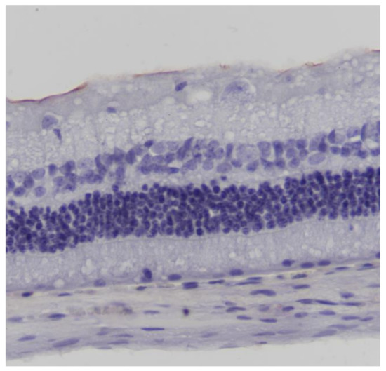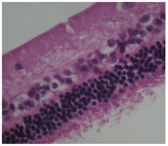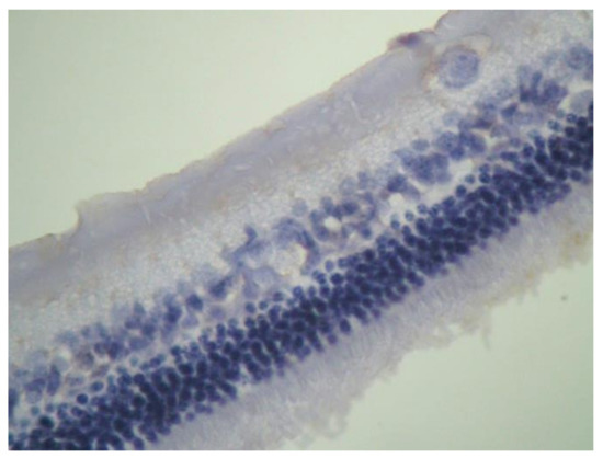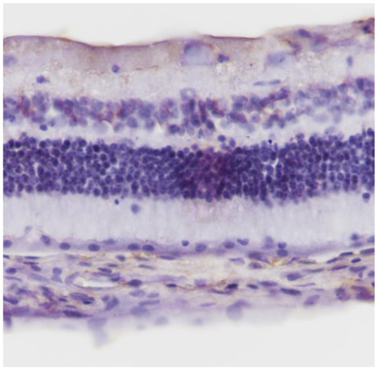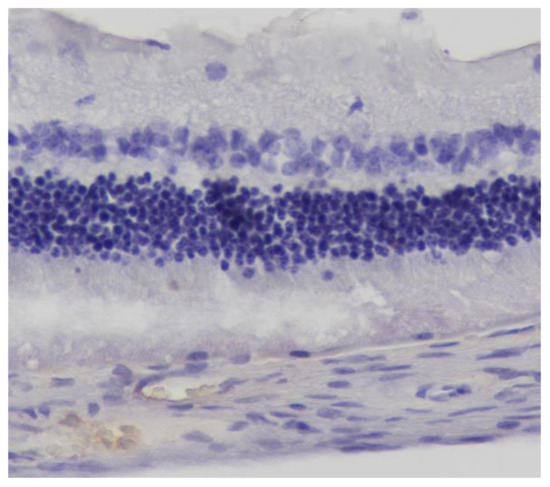 Eosin-hematoxylin staining did not reveal any pathological changes in all samples (Figure 12). Regarding the immunohistochemical stainings for IL-6 as well as TNF-a markers, they were detected as negative (−) in all samples (Figure 13 and Figure 14). Electron microscopy revealed a pathological structure of the outer part of the inner segment of the photoreceptors in the photoreceptor layer. Separation between the outer and inner segment and the absence of the connecting cilium of the photoreceptors was observed. In the outer segment, the membranes are separated in the middle leaving a gap and are not parallel to each other. In addition, the mitochondria in the inner segment were enlarged with minimal folds. (Figure 15). Also, some nuclei of the photoreceptors presented degeneration in the outer nuclear layer with vacuoles in the intercellular space (Figure 16). In the ganglion cell layer, ganglion cells presented a vacuolated cytoplasm with only few organelles (Figure 17). The ultrastructural lesions were observed in all samples.