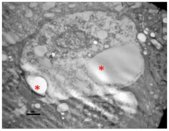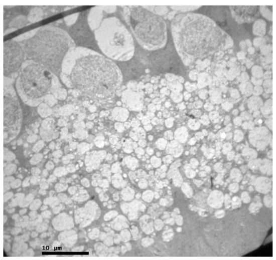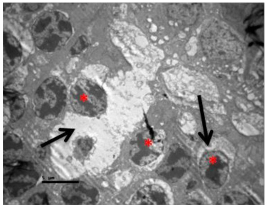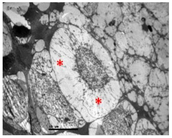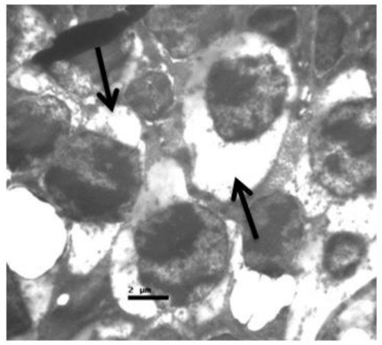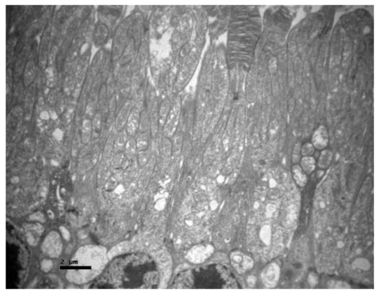 No macroscopic lesions were found in all samples. Light microscopic examination of eosin-hematoxylin stained sections did not reveal any histopathological changes in all samples (Figure 6). The immunohistochemical staining for the IL-6 marker was determined as mild (+) with the presence of lymphocytes, in all samples (significant difference between group V and all other groups) (Figure 7). On the other hand, staining for TNF-a marker was found negative (−), in all samples (significant difference from IL-6 within the group) (Figure 8). Electron microscopy revealed rods and cones with sparse cytoplasm around the nucleus in the outer nuclear layer (Figure 9). In the nerve fiber layer, loss of the organized structure of neurofibrils and microtubules in addition to merging of the unmyelinated nerve fibers were observed. Ganglion cells presented vacuolization as well as dilatation of the rough endoplasmic reticulum in the ganglion cell layer (Figure 10 and Figure 11). The ultrastructural lesions were observed in all samples.
