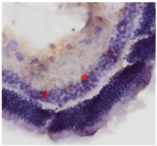 Group M. Degeneration of some photoreceptors’ nuclei (*) and vacuoles in the intercellular space (↑).