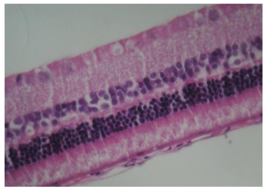Regarding to micafungin, according to Paris and colleagues, intravitreal administration of micafungin at a dose of 150 μg to rabbit eyes does not cause ERG lesions [62]. However, ERG was the only method of detecting retinal damage, as no histological analysis was performed. According to Kapur, intravitreal administration of micafungin to rabbit eyes at a dose of up to 0.025 mg/0.1 mL did not cause histopathological lesions or ERG lesions, suggesting this dose as a safe non-toxic starting dose with adequate antimicrobial action and therefore for future use in humans for the treatment of fungal endophthalmitis [76]. However, Kapur’s findings are consistent with our findings, as for the same dose of 0.025 mg/0.1 mL micafungin, eosin-hematoxylin staining showed no morphological changes in the retina.