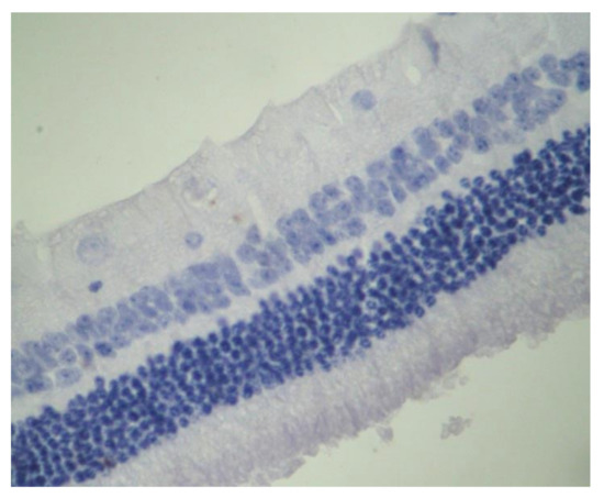 No macroscopic lesions were found in all samples. Light microscopic examination of eosin-hematoxylin stained sections did not reveal any histopathological changes (Figure 1), while the immunohistochemical stainings for TNF-a as well as IL-6 markers were found to be negative (−) in all samples examined (Figure 2 and Figure 3). Electron microscopy did not reveal any ultrastructural pathological alterations in the retina in all samples (Figure 4 and Figure 5).