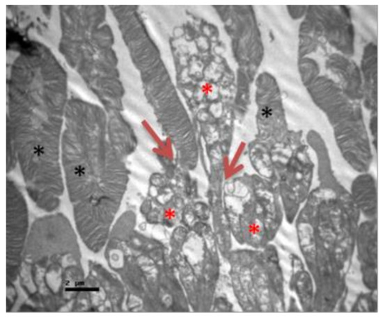 Group M. Separation between the outer and inner segment and absence of the connecting cilium of the photoreceptors. (↑) In the outer segment, the membranes are separated in the middle leaving a gap and are not parallel to each other. (*) Εnlarged mitochondria in the inner segment with minimal folds (*).