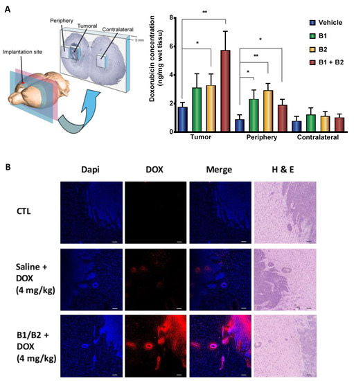 F98-bearing rats were anesthetized with a mixture of ketamine: Xylazine (87:13 mg/kg, intraperitoneal), and the external carotid artery was catheterized in a retrograde fashion using PE-50 intramedic tubing such that the tip of the catheter lay just above the bifurcation. For the BBB permeabilization procedure, the animals received a single intracarotid infusion of vehicle (sterile 0.9% saline), B1R agonist (NG29; 50 nmol/kg/min for 5 min), B2R agonist (NG291) (10 nmol/kg/min for 5 min), or a combination of NG29 and NG291. Immediately after the end of the BBB disruption procedure, doxorubicin (4 mg/kg; 500 μL, 5 min) (Pfizer, 2 mg/mL stock; provided by the Pharmacy Department of the CHUS (Canada)) was infused via the same cannula. Total volume infused was kept constant at 1.0 mL. One hour after the end of the infusion, anesthetized rats were euthanized by transection of the vena cava followed by an intra-cardiac injection of saline (200 mL) in order to flush the blood from the brain. The brain was rapidly removed and placed in physiological saline. The tumors, as well as size-related samples of peritumoral tissue and matched tissue located in the contralateral hemisphere, were resected. These samples were weighed (~30–50 mg/sample) and soaked in acidified ethanol (50% ethanol in 0.3 N HCl). After homogenization with a tissue blender (IKA works Inc., Wilmington, NC, USA) and refrigeration for 24 h at 4 °C, the samples were centrifuged at 16,000× g for 25 min. Supernatants were collected, concentrated using a Speed-Vac (SC 110A Concentrator, Thermo Savant, Holbrook, NY, USA), and resuspended in 100 μL of acidified ethanol. The fluorescent intensity of the sample (100 μL each) was measured in a 96-well microplate using a benchtop fluorometer (Infinite M1000; Tecan Group Ltd., Mannedorf, Switzerland; Ex/Em: 480/590 nm). The concentration of DOX was determined from a standard calibration curve derived from twelve serial concentrations (1 ng–0.1 mg/100 μL) (Graph Prism 8.2). For illustrative purposes, biodistribution of DOX in brain tumors was also assessed in some of the above experimental groups (untreated control, vehicle saline + DOX or B1/B2 agonists + DOX) using confocal microscopy. Then, 24 h after treatments, animals were euthanized and exsanguinated under anesthesia, as mentioned above. Thereafter, brains were harvested, embedded in OCT, and flash-frozen in liquid nitrogen. Frozen tissues were kept at –80 °C until further processing. Brain tissues were cut on a cryostat in 20 µm-thick coronal sections, and the tissue slices were thaw-mounted onto surface-treated glass slides (Superfrost plus, ThermoFisher Scientific, Burlington, ON, Canada). The fluorescence characteristics of DOX were used to directly monitor localization of this drug without utilizing additional dye.
