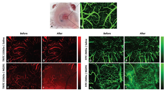 To capture in vivo images of the effects of kinin B2R agonist on healthy, noncompromised BBB permeability, we used intravital microscopy via an open-skull cranial window with a glass cover to allow the qualitative direct visualization of cerebrovascular changes to a defined cortical area in real-time (Figure 2A). To visualize the cortical vascular network and assess BBB integrity, fluorescently labeled dextrans with molecular weights of 155 kDa and 2 MDa (hydrodynamic diameter: ~17 to 54 nm, respectively) were first delivered via intravenous (i.v.) injection. These were used respectively as models of monoclonal antibodies (mAbs) and nanoparticles (NPs)-based drug formulations, both of which are currently viewed as very promising approaches in the fight against malignant brain cancers [34]. No spontaneous microvascular leakage was observed immediately after injection of the fluorescent tracers (Figure 2B,C,E,G,I), indicative of a preserved BBB integrity. Next, sequential imaging was performed to monitor the leakage of labeled dextran for 30 min after the injection of either vehicle saline or NG291 (Figure 2C–J). While the control group exhibited no significant change (Figure 2D,H), we observed clear leakage of both fluorescent dyes into the perivascular area after NG291 injection (50 μg/kg, bolus injection, see also Supplementary Videos S1 and S2). The extent of leakage appeared to be more important for the smaller (155 kDa) than for the larger dye (2 MDa) (Figure 2F,J). Although generally well-tolerated, the high dose of intravenous NG291 was associated with a strong but reversible hypotensive effect (about -35 mmHg) in ketamine/xylazine-anesthetized normal mice (not shown). These findings are in agreement with previous studies [18,26,27,28].
