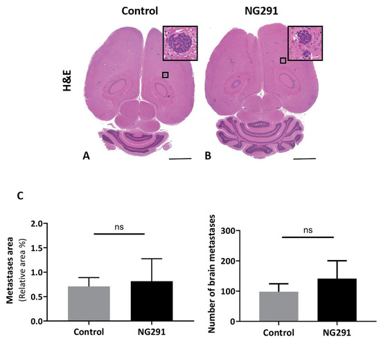 Effects of acute administration of NG291 on breast cancer dissemination to the brain. Quantification of metastases area on histological brain slides 18 days following intracardiac injection of 4T1 cells. The control group received only an intracardiac injection of 4T1 cells. In the NG291 group, 4T1 cells were injected with the B2R agonist. (A,B) Representative H and E staining of brain sections from animals in the aforementioned groups (magnification 1×; scale bar: 2 mm). Insets are high-resolution images (40× magnification) of the area in the black box. (C) Quantification of surface area and number of cerebral metastases. Results are presented as the percentage of metastasis area relative to the entire brain section. There was no difference in terms of both area and number of metastases between the group injected with NG291 and the group injected with saline. Data are presented as means ± SEM for 6–8 animals. p > 0.05 vs. control group, nonsignificant (NS), unpaired two-tailed Mann–Whitney test, (GraphPad Prism 8.2).
