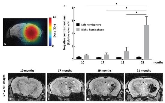 MRI studies in the mouse model of delayed cerebral radiation necrosis. (A) Treatment plan showing radiation contours superimposed on MR images of a mouse brain. The mouse brain right hemisphere was irradiated with a single radiation dose of 23.1 Gy at the 50% isodose (2.933 Gy/min; corresponding to a dose of 45 Gy at 100%). Pseudo-color bar indicates radiation dose. Representative T2*-weighted images of irradiated mice at (B) 10, (C) 17, (D) 19, and (E) 21 months after irradiation. The T2*-weighted sequence was used to detect necrosis, as necrosis results in the accumulation of hemoglobin residues (deoxyhemoglobin, hemosiderin, and ferritin) and T2*-weighted images are sensitive to the presence of those residues, which will produce negative contrast in the image. (B) At 10 months, T2*-weighted images show no sign of hemorrhage related to the presence of necrosis. (C) At 17 months, a small volume of negative contrast is observed in the region that received 100% of the radiation dose (white arrows). (D–E) This volume of negative contrast expands over time (white arrow) up to 21 months. (F) Negative contrast extracted from T2*-weighted images increases in the irradiated hemisphere. Bars indicate mean ± SEM (n = 3–4 animals). * p < 0.05 as compared to corresponding group, unpaired two-tailed Mann–Whitney test (GraphPad Prism 8.4).