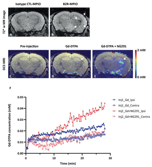Microparticles of iron oxide (MPIO, size range 0.76–1.63 μm) with p-toluenesulfonyl reactive surface groups (Invitrogen, Carlsbad, CA, USA) were conjugated to purified polyclonal rabbit anti-mouse antibodies specific to the BK-B2R (OABF00968, Aviva Systems Biology, San Diego, CA, USA; B2R-MPIO) or normal rabbit IgG as a negative control (2729S, Cell Signaling Technology, Danvers, MA, USA; isotype control, CTL-MPIO), following a method described previously [64]. MRI acquisition was performed before and 3 h after i.v. injection (0.125 mg Fe in 100 μL PBS) of one of these conjugated MPIOs.