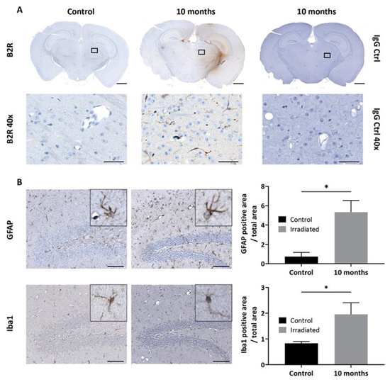 (A) Immunohistological detection of B2R expression in the mouse brain after irradiation. Minimal basal expression of B2R is detected in the brain of the control nonirradiated animal. Immunohistochemistry for B2R in a brain section of a representative animal at 10 months (middle) after irradiation confirms B2R expression in brain vessels (magnification 1× scale bar: 1 mm). No staining is observed with IgG antibody control. Images in the lower panel are high-resolution images of the area in the corresponding black rectangle (40× magnification, scale bar 50 µm). (B) Representative immunohistopathological images of glial activation after mouse brain irradiation. Nonirradiated (left panel) and irradiated (right panel) brain sections were stained with glial fibrillary acidic protein (GFAP) (astrocytes) or Iba1 (microglia)-targeted antibodies (magnification 20×; scale bar: 100 µm). Insets are high-resolution images showing cell morphology (magnification 80×). Bars indicate mean ± SEM (n = 4 animals per group). * p < 0.05 as compared to control group, unpaired one-tailed Mann–Whitney test (GraphPad Prism 8.4).