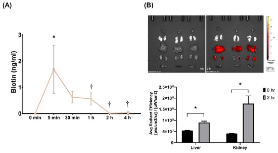 Pharmacokinetics and biodistribution of SEM18 peptide. (A) Pharmacokinetic analysis of SEM18 peptide. A single dose of biotin-conjugated SEM18 peptide (0.3 mg/kg) was administered. The plasma concentrations of SEM18 peptide were determined via measuring plasma biotin concentrations using enzyme-linked immunosorbent assay (ELISA), as measured at 0 min (baseline), 5 min, 30 min, 1 h, 2 h, and 4 h after intraperitoneal (i.p.) administration of SEM18 peptide; (B) Biodistribution of SEM18 peptide, as measured at 0 h (baseline) and 2 h after i.p. administration using ex vivo bioluminescence imaging assay. Data are presented as the mean ± standard deviation. Data of pharmacokinetics and biodistribution were derived from three mice at each time point. * p < 0.05 vs. the baseline value; † p < 0.05 vs. the value measured at 5 min after administration.