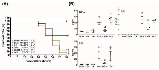 The 48 h survival rates are illustrated in Figure 2A. The 48-h survival rates were measured at 48 h after LPS or NS administration. The 48 h survival rates in the sham, SEM18, and CP groups were all 100%. The 48 h survival rate in the LPS group (14.3%) was significantly lower than that in the sham group (p < 0.001). By contrast, the 48 h survival rate in the LSEM group (57.1%) was significantly higher than those in the LPS and the LCP groups (7.1%) (p = 0.030 and 0.026, respectively).