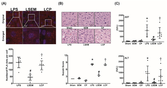 Histological analysis and Suzuki’s scores (liver damage assessment) of the liver tissues measured at 24 h after LPS or NS administration are illustrated in Figure 3B. Figure 3C illustrates the plasma concentrations of aspartate transaminase (AST) and alanine transaminase (ALT) measured at 24 h after LPS or NS administration. Histological analysis of the sham, SEM, and CP groups revealed no significant liver injury, and the Suzuki’s scores and plasma AST and ALT concentrations were low. In contrast, significant liver injury in the LPS group was observed. The Suzuki’s scores and plasma AST and ALT concentrations in the LPS group were significantly higher than in the sham group (all p < 0.001). Histological analysis further revealed lower levels of liver injury in the LSEM group than in the LPS group. The Suzuki’s scores and plasma AST and ALT concentrations in the LSEM group were significantly lower than in the LPS group (p < 0.001, p < 0.001, and p = 0.017, respectively). Moreover, analyses revealed that the differences between the LSEM and LCP groups paralleled those between the LSEM and LPS groups.
