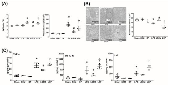 Analyses of wet/dry weight ratio (i.e., liver water content) and polymorphonuclear neutrophil (PMN) infiltration in liver tissues measured a 24 h after LPS or NS administration are illustrated in Figure 4A. Figure 4B,C illustrate hepatic concentrations of inflammatory cytokines and mitochondrial injury in liver tissues measured at 24 h after LPS or NS administration. Analyses of wet/dry weight ratio, PMN infiltration, inflammatory cytokine concentrations, and mitochondrial injury in the liver revealed similar pictures in the sham, SEM, and CP groups. Notably, the wet/dry weight ratio and level of PMN infiltration in liver tissues of the LPS group were significantly higher than in the sham group (p = 0.006 and p < 0.001, respectively). The hepatic concentrations of TNF-α, pro-IL-1β, and IL-6 in the LPS group were significantly higher than those in the sham group (all p < 0.001). On the contrary, the mean intact mitochondrion number in liver tissues of the LPS group was significantly lower than that in the sham group (p = 0.015). The wet/dry weight ratio and PMN infiltration level in the LSEM group were significantly lower than those in the LPS group (p = 0.005 and p = 0.014, respectively). The hepatic concentrations of TNF-α and pro-IL-1β in the LSEM group were significantly lower than those in the LPS group (p < 0.001 and p = 0.019, respectively). Of note, the hepatic IL-6 concentration in the LPS group was higher than that in the LSEM group. However, the between-group differences did not reach statistical significance. Therefore, hepatic IL-6 concentrations in the LSEM and LPS groups were not significantly different (Figure 3C). Notably, the mean intact mitochondrion number in the LSEM group was significantly higher than that in the LPS group (p = 0.035).