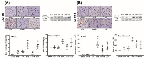 Analyses of necroptosis and pyroptosis in liver tissues measured at 24 h after LPS or NS administration are illustrated in Figure 5A,B. Expression levels of necroptosis-related protein (i.e., phosphorylated mixed lineage kinase domain-like pseudokinase (p-MLKL) and cleaved caspase 8) and pyroptosis-related protein (i.e., NLRP3 and cleaved caspase 1) in liver tissues of the sham, SEM, and CP groups were low. Expression levels of p-MLKL, NLRP3, and cleaved caspase 1 in the LPS group were significantly higher than those in the sham group (all p < 0.001). Although the expression level of cleaved caspase 8 in the LPS group was higher than that in the sham group, the between-group differences did not reach statistical significance. Compared with the LPS group, significantly lower expression levels of p-MLKL, cleaved caspase 8, NLRP3, and cleaved caspase 1 were observed in the LSEM group (p < 0.001, p = 0.035, p < 0.001, and p = 0.024, respectively). The differences between the LSEM and LCP groups paralleled those between the LSEM and LPS groups, except that the differences in cleaved caspase 8 and cleaved caspase 1 between the LSEM and LCP groups were nonsignificant.