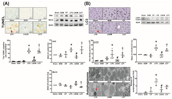 Analyses of apoptosis and autophagy upregulation in liver tissues measured at 24 h after LPS or NS administration are illustrated in Figure 6A,B. The terminal deoxynucleotidyl transferase dUTP nick-end labeling (TUNEL)-positive cell counts, expression levels of pro-appoptotic Bax and autophagy-related protein microtubule-associated protein 1A/1B-light chain 3 (LC3), ratios of LC3-II/LC3-I, and mean numbers of autophagosomes in liver tissues of the sham, SEM, and CP groups were low. These parameters were significantly higher in the LPS group than in the sham group (p < 0.001, p = 0.036, p < 0.001, p < 0.001, and p < 0.001, respectively) and the LSEM group (p < 0.001, p < 0.001, p < 0.001, p < 0.001, and p = 0.013, respectively). The differences between the LSEM and LCP groups also paralleled those between the LSEM and LPS groups, except that the difference in autophagosome numbers between the LSEM and LCP groups was not significant. The antiapoptotic Bcl-2 expression levels in the sham, SEM, and CP groups were not significantly different (Figure 6A). Notably, the Bcl-2 expression levels in the LPS and sham groups were not significantly different, wheras the Bcl-2 expression level in the LSEM group was significantly higher than that in the LPS and LCP groups (p = 0.020 and 0.008, respectively).