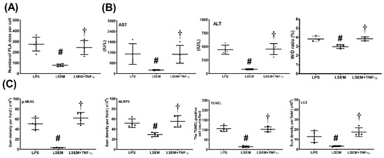 Figure 7 illustrates the effects of exogenous TNF-α. Our data demonstrated that hepatic PLA signal intensity (p < 0.001), plasma concentrations of AST and ALT (p = 0.003 and p = 0.014, respectively), and the wet/dry weight ratio (p = 0.001) of liver tissues were significantly higher in the LSEM + TNF-α group than in the LSEM group. Moreover, expression levels of p-MLKL, NLRP3, and LC3 in liver tissues and the TUNEL-positive cell counts were significantly higher in the LSEM + TNF-α group than in the LSEM group (p < 0.001, p < 0.001, p = 0.004, and p < 0.001, respectively). Of note, the differences between the LSEM and LSEM + TNF-α groups paralleled those between the LSEM and LPS groups. Collectively, these data illustrated the effects of exogenous TNF-α on counteracting the therapeutic effects of SEM18 peptide.