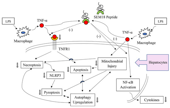 The present study confirmed the therapeutic effects of SEM18 peptide against liver injury induced by endotoxin. Hepatocytes (i.e., the functional cells of the liver) constitute approximate 80% of liver mass [29]. It is likely that the observed SEM18 peptide effects against endotoxin-induced liver injury were mainly from hepatocytes. This concept is supported by a follow-up cellular study conducted in our laboratory. Our data demonstrated that SEM18 peptide can mitigate cytokine (e.g., IL-1β) production induced by TNF-α in primary hepatocytes (please see Figure S1, Supplementary Materials). Taking these above-mentioned data and information together, we propose some mechanisms that underlie the therapeutic effects of SEM18 peptide against endotoxin-induced liver injury. We propose that SEM18 peptide can act by binding with circulating TNF-α to decrease hepatocyte exposure to circulating TNF-α. With decreased exposure to circulating TNF-α, SEM18 peptide can then inhibit activation of NF-κB, upregulation of cytokines, and injury of mitochondria in hepatocytes. Moreover, with decreased exposure to circulating TNF-α, SEM18 peptide can then mitigate TNF-α binding to the transmembrane death receptor TNFR1 and subsequently inhibit the death processes of necroptosis, pyroptosis, apoptosis, and autophagy upregulation in hepatocytes. The proposed possible mechanisms are summarized in Figure 8.