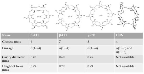 Cyclodextrins (CDs, Figure 1) are torus-shaped oligosaccharides made up of α-(1,4)-linked glucose units, obtained by the degradation of starch by the enzyme cyclodextrin glucosyltransferase (CGTAse), which were (CDs) discovered by Antoine Villiers [1]. Although the most common CDs are the natural α, β, and γ-CD forms (which contain six, seven, or eight glucose units, respectively), CDs containing nine and up to nineteen units have also been characterized [2,3], although they are not used because of their tendency to collapse. Recently, even smaller CDs with 3 or 4 glucose units have been synthesized [4].