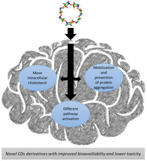 Another possibility is to use polymers, formed by covalent bonds or cyclodextrin-based polyrotaxanes (CDPRX) [54]. As the cavity is covered by the polyrotaxane, the CD cannot take cholesterol of the membranes, reducing its toxicity. Moreover, the structure of CDPRX improves endocytosis [54]. Another interesting polymer is ORX-301, a pH sensitive β-CD-based polymer with a better pharmacokinetics and bioavailability [55].