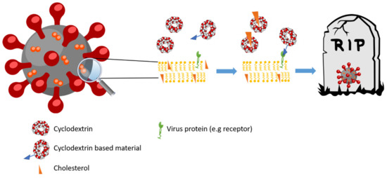 The capacity to complex cholesterol is the principal mechanism through which CDs can reduce the infectivity of several viruses, as summarized by Braga in 2019 [18]. However, in recent studies novel derivates, which are able to directly block some parts of the virus have been prepared.