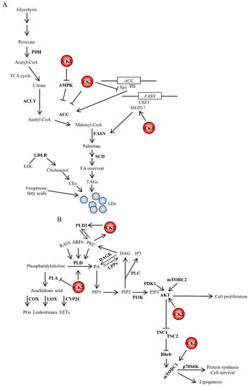 The regulation of de novo lipogenesis occurs mainly at the transcriptional level and involves the activation of sterol regulatory element-binding proteins (SREBPs) that are basic helix-loop-helix transcription factors regulating the synthesis of cholesterol and FAs []. SREBP1a and SREBP1c result from the alternative splicing of the SREBPF1 gene while SREBP2 is encoded by the SREBPF2 gene []. In mammals, SREBP1 is mainly involved in the regulation of genes coding for proteins involved in FAs synthesis while SREBP2 controls the synthesis of cholesterol. The PI3K-AKT-mTORC1 signaling cascade regulates the maturation of SREBP1. The inhibitory phosphorylation of the phosphatidic acid phosphatase lipin 1 (LPIN1), which is a negative regulator of nuclear SREBP1, by mTORC1 leads to induction of SREBP1 thereby promoting expression of its target genes including FASN, ACLY, ACC and SCD1 [,]. Since lipogenesis is one of the key processes supporting the proliferative status of cancer cells, it is not surprising that the activity of SREBP1 is higher in cancer cells than in normal tissues and that pharmacological targeting of this transcription factor can have a favorable response in the treatment of cancer. This is supported by in vivo studies employing EGFRvIII-bearing glioblastoma cells showing the high dependency of the cells on SREBP1 for survival and demonstrating that inhibition of SREBP1 and FASN, respectively, promotes massive tumor cell death in cancer cells bearing activated EGFR signaling [].