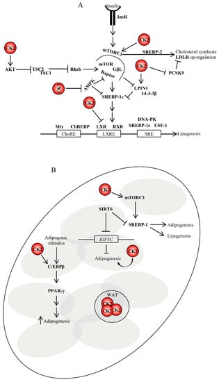 - Li, S.; Brown, M.S.; Goldstein, J.L. Bifurcation of insulin signaling pathway in rat liver: mTORC1 required for stimulation of lipogenesis, but not inhibition of gluconeogenesis. Proc. Natl. Acad. Sci. USA 2010, 107, 3441–3446. [Google Scholar] [CrossRef] [PubMed]