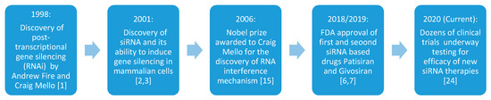 In 1998, Andrew Fire and Craig Mello published a seminal paper in which they discovered the phenomenon of post-transcriptional gene silencing (PTGS) and termed it as RNA interference (RNAi) [1]. Later, in 2001, two research groups reported that 21 to 22 nucleotide(nt) double-stranded RNAs, popularly known as small interfering RNAs (siRNAs), can induce gene silencing in mammalian cells without causing nonspecific interferon response [2,3]. siRNAs, composed of a duplex of 20 to 24 nucleotide base pairs, work by interacting with the RNAi pathway enzyme dicer for cleavage. The single-stranded antisense strand complementary to the target mRNA is handed to the RNA- induced silencing complex (RISC) loading complex (RLC), which destroys the target mRNA, hence silencing the target gene or, in other words, inhibit the formation of the target protein [4]. Section 2 further explains the mechanism of siRNA in detail. These siRNAs later kicked off a revolution in biology due to their potential to inhibit virtually all genes by a base sequence of target mRNA alone, which gives RNAi several advantages over small-molecule drugs as a therapeutic strategy [5]. Approval of the first siRNA-based drug patisiran (Onpattro™) by the U.S. Food and Drug Administration (FDA) in 2018 for polyneuropathy of hereditary transthyretin-mediated amyloidosis has fostered a new interest by the pharmaceutical as well as academic research groups in RNAi based drugs [6]. Recently in 2019, givosiran (Givlaari™) has been approved by the US FDA for acute hepatic porphyria [7], which has further reinforced the confidence in siRNA based products. A timeline of these events is shown below in Figure 1.