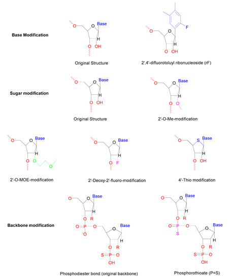 Researchers have turned on modifying the sugars, backbone, or bases of oligoribonucleotides for stabilization to overcome intravascular degradation [56]. The modification of base with internal uridine to rF (2,4-difluorotoluyl ribonucleoside) substitutions shows better resistance towards intravascular degradation by nucleases in the serum [57]. Modification of both the sense and antisense strand enhances the nuclease resistance in the serum [58]. In the case of sugar modifications, 4′-thioribonucleosides modification shows higher resistance towards serum nucleases [59]. If ribose 2′-OH group modified with a CH3 group or fluoride atom within both the sense as well as antisense strand, enhanced their resistance towards endonucleases and also improved therapeutic potency of siRNA [60]. A study demonstrated that the siRNA modified with the 2′fluoro group significantly enhanced resistance towards nucleases in plasma but unable to generate prolonged silencing in mice and cell cultures [61]. Figure 3 illustrates these modifications. It has been suggested that modification of siRNA with small molecules such as 2,4-dinitrophenol (DNP) not only increases their ability to resist nucleases, but it also enhances their membrane impermeability [62]. Some reputed modifications of siRNA are presented in Table 3.