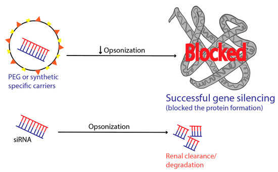 To achieve cell permeation of siRNA for effective concentration within the cell, a positively charged carrier is an essential requirement. Blood complement proteins and cell membrane proteins are usually negatively charged in the systemic circulation. The surface of the siRNA loaded carrier is positively charged, and it can be readily opsonized by opsonin proteins or may cause un-specific interaction with the cell membrane proteins [104]. Opsonins are essentially blood complement proteins or immunoglobulins. These blood complement proteins bind with the positively charged siRNA carriers through electrostatic interaction. The opsonization mechanism can occur anywhere in the blood circulation, completing from seconds to days. The opsonized carriers then undergo reticuloendothelial system (RES) filtration, and their cell surface binding leads to inflammation. The opsonization process makes siRNA carriers more susceptible to RES filtration and results in fast renal clearance (Figure 4) [55]. Opsonized carriers loaded RNA drugs accumulate in the liver and spleen and may cause toxic effects [105]. Thus, ultimately opsonization process reduces the therapeutic concentration needed for their efficient RNAi activity [55].
