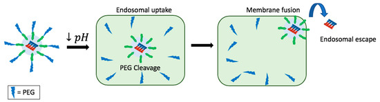 Additionally, recent reports have cited the development of a PEG-based cleavable polymeric system, composed of nonlamellar highly fusogenic lipid nanoparticles that are further stabilized by surface-exposed PEG-conjugated vinyl ether lipids [124]. Its mechanism of action involves the hydrolysis of the vinyl ether bond at low pH inside of the endosomal environment, which results in the destabilization of the liposome and removal of PEG (Figure 6) [45]. This destabilization allows for the fusion between the liposome and endosomal membrane, ultimately releasing the siRNA in the cytosol efficiently, escaping the endosome [124].