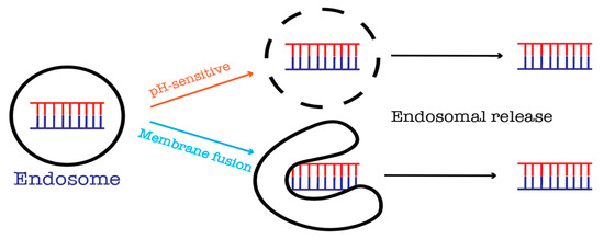 Following the internalization of the siRNA, a major barrier remains to be its inability to escape endosomes. Thus, a carrier or modification that allows for the disruption of the endosomal membrane is essential for efficient endosomal escape and gene silencing by siRNA. Many recent delivery vehicles have taken advantage of the change from extracellular to the endosomal environment. Among the many differences, the change in pH is often utilized for efficient endosomal disruption and further release of siRNA once inside the target cell [117]. Protonable cationic polymers have been shown to increase delivery efficiency due to their high buffering capacity [45].