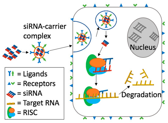 As discussed earlier, naked siRNA cannot cross the plasma membrane because of its negative charge. Despite its small size, the negative charge and high hydrophilicity prevent siRNA from passing through the biological membrane. Hence, efficient delivery of siRNA needs modification to overcome this barrier [112]. In this context, carriers that enable efficient siRNA delivery are required. Complexation of siRNA with cationic polymers or lipids can mask the net negative charge of siRNA. Furthermore, these nanoparticles with positive charge interact with the negatively charged biological membrane, thus causing internalization [113]. Alternatively, efficient delivery of siRNA can be achieved by conjugating the siRNA with ligands, immunoglobulins, or aptamers that recognize specific antigens on target cells. When these conjugates bind to the cell, the siRNA uptake is done by receptor-mediated endocytosis resulting in endosomes formation with subsequent siRNA delivery into the cytoplasm [112]. Figure 5 illustrates this concept.