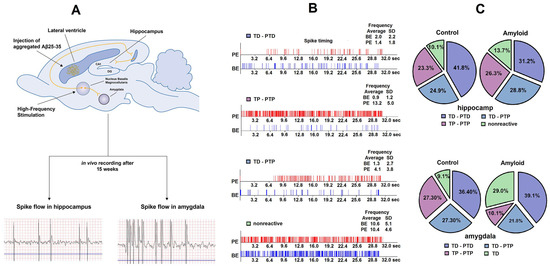 Graphical illustration of the whole electrophysiological experiment. (A) Typical example of in vivo recording of spike flow in single hippocampal and amygdala neurons. (B) Examples of spike activity of a single neuron: pulse flow in a real-time 30 s before stimulation (BE, before the event) and 30 s after stimulation (PE, post-event). (C) The percentage distribution of specific types of responses (tetanic depression-post-tetanic depression (TD-PTD), tetanic potentiation-post-tetanic potentiation (TP-PTP), tetanic depression-post-tetanic potentiation (TD-PTP), and no reactivity) of hippocampus and amygdala neurons to high-frequency stimulation of nucleus basalis magnocellularis in the control and amyloid groups.
