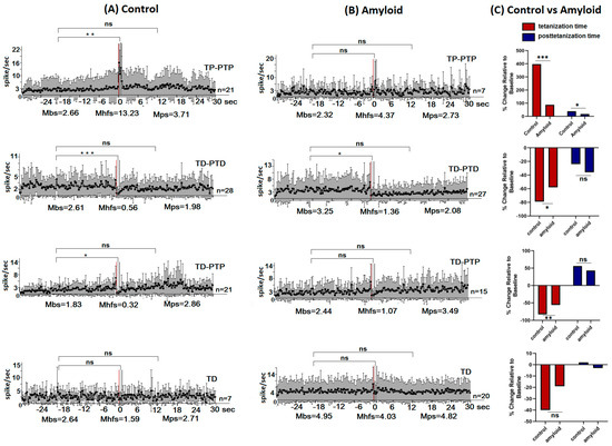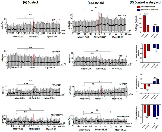 The background/baseline (Mbs) spike train frequency of the amyloid group’s hippocampal neurons was significantly higher in the neural populations with TP-PTP (12.83 vs. 5.22 spike/s), TD-PTD (9.29 vs. 7.13 spike/s), and non-reactive (15.39 vs. 9.58 spike/s) (Figure 2B) rates compared to the control group (Figure 2A).