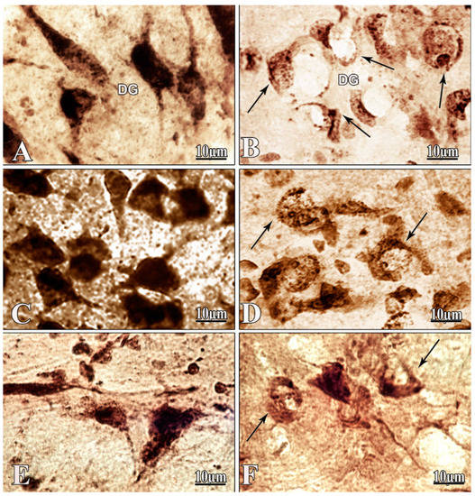 Images of morphologically examined neurons of hippocampus, amygdala, and nucleus basalis magnocellularis (NBM) in the control and amyloid groups. Frontal slices of hippocampal (A), amygdala (C), and NBM (E) neurons of the control rat brain. Degenerated, swollen neurons with eccentrically disposed nuclei (indicated by black arrows) of the hippocampus (B), amygdala (D), and NBM (F) after bilateral intracerebroventricular (i.c.v.) injection of Aβ 25–35. DG—dentate gyrus of the hippocampus. Magnification: ×1000 (A–F).