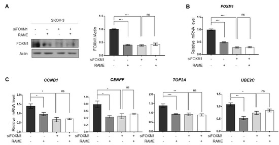 RAME inhibited FOXM1 target genes by downregulating FOXM1 and its binding with its target genes (Figure 1C,D and Figure 2). To ascertain whether RAME regulates the expression of FOXM1 target genes via FOXM1 inhibition, not other molecular pathways, SKOV-3 ovarian cancer cells were transfected with siFOXM1 for knocking down FOXM1. As shown by immunoblot analysis, FOXM1 levels were reduced in RAME-treated (40 µM) SKOV-3 cells. On the other hand, RAME did not reduce the FOXM1 levels in the FOXM1-knockdown cells (Figure 4A). Likewise, the mRNA levels of FOXM1 were also suppressed in SKOV-3 cells after RAME (40 µM) treatment, but not in RAME-treated FOXM1-knockdown cells (Figure 4B). In addition, RAME treatment suppressed the expression of FOXM1 target genes. Conversely, there was no change in the expression of FOXM1 target genes in FOXM1-knockdown cells, following RAME treatment (Figure 4C). Collectively, these results revealed that FOXM1 target genes are regulated via FOXM1 and not the other pathways.