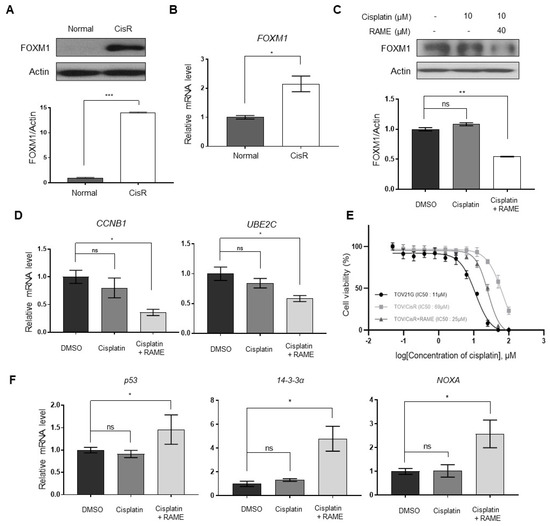 It was reported that cisplatin-resistant cancer cell lines showed elevated FOXM1 levels [30]. To confirm this, we established cisplatin resistant ovarian cancer cell line using TOV-21G cells, which have low FOXM1 expression than SKOV-3 cell (Figure S3) and performed an immunoblotting assay in TOV-21G and cisplatin-resistant TOV-21G cells. In the cisplatin-resistant TOV-21G cell line, FOXM1 levels were considerably elevated, compared to the TOV-21G cell line (Figure 5A,B). Within this cisplatin-resistant TOV-21G cell line, we checked the differences in FOXM1 levels after treatment with cisplatin and RAME. Although the cisplatin-only treated group did not show any changes in the FOXM1 levels, the cells treated with cisplatin and RAME showed reduced FOXM1 levels (Figure 5C). We also confirmed that the downregulation of FOXM1 by RAME reduced the mRNA expression levels of the FOXM1-binding genes CCNB1 and UBE2C (Figure 5D). The cells treated with both cisplatin and RAME showed reduced viability, compared to those treated with cisplatin only (data not shown); hence, we performed cell viability assays of the TOV-21G cell line under several conditions. The cisplatin-resistant TOV-21G cell line showed a higher IC50 value than the normal TOV-21G cell line, but this IC50 value was reduced in the presence of RAME (Figure 5E). Moreover, in the cisplatin-resistant TOV-21G cell line, genes related to cell apoptosis showed increased mRNA expression levels, only following treatment with both cisplatin and RAME (Figure 5F). In conclusion, RAME induced accelerated anti-cancer effects by regulating FOXM1 expression levels, and it could be considered to be a potential anticancer therapeutic.