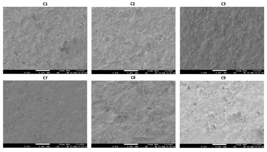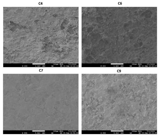 The surface morphology of the coated tablets showed rough surface with pinholes, cratering, and crevices. However, the degree of surface deformation decreased with an increase in the coating weight. The C3 formulation (coated at 10.75% weight gain) showed less deformity than C1 (coated at 5.21% weight gain). Similarly, no effects of C-A-P or CAB 171-10 polymer percentage in the coating formulation on surface morphology were observed (Figure 1).