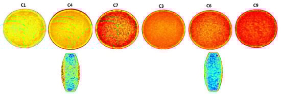 Near infrared hyperspectroscopy provided chemical and spatial information about the samples. Hypercube data were base line corrected and mathematically treated by standard normal variate to generate principal component analysis (PCA) images. The PCA images of the coated tablets and half-cut tablets are shown in Figure 2. The pixel color was relatively uniform in the coated tablets. Pixel colors changed from yellow to red (C1, C4, and C7) with the composition of the polymer blend in 5% coated tablets. The pixel color did not change significantly in 10% coated (C3, C6, and C9). Furthermore, coating thickness can be visualized in the coated tablets. As expected, the coating was relatively thinner in the 5% coated tablets compared to the 10% coated ones. The core tablets can also be visualized from half-cut tablets as it showed multicolored pixels indicating the multicomponent nature of the core tablets.