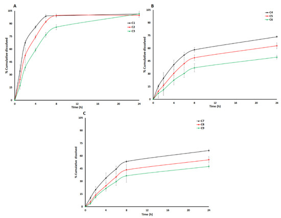 The dissolution varied as a function of the coating composition and coating weight gain. The thickness of the coating on the core tablet increased with an increase in the percentage coating weight gain. The C-A-P polymer and PEG dissolved during the dissolution process leaving behind a porous film of CAB 171-15 polymer with micro-holes. The degree of porosity controls the rate of penetration of the dissolution medium and drug diffusion. A thicker film leads to a decreased permeability of the dissolution medium to penetrate the tablet and less diffusion of the dissolved drug [36]. Increasing the CAB 171-10 content of the blends resulted in decreased porosity and decreased the dissolution rate (Figure 3). The coating shell remained intact after 24 h when the coating composition contained 50% or more CAB 171-15 relative to C-A-P. This explained the shorter duration of the sustained dissolution (4–8 h) in the formulations containing low percentages of CAB 171-15 (C1–C3, 33.3%) compared to ones (C4–C9, 50–66.7%) containing a high percentage of CAB 171-15. A higher percentage of CAB 171-15 in the coating composition resulted in a more compact film that remained intact for longer time and thus sustained the drug dissolution for longer duration (C4–C9). Dissolution profiles can be divided into three distinct phases, namely initial, middle, and later (Figure 3).
